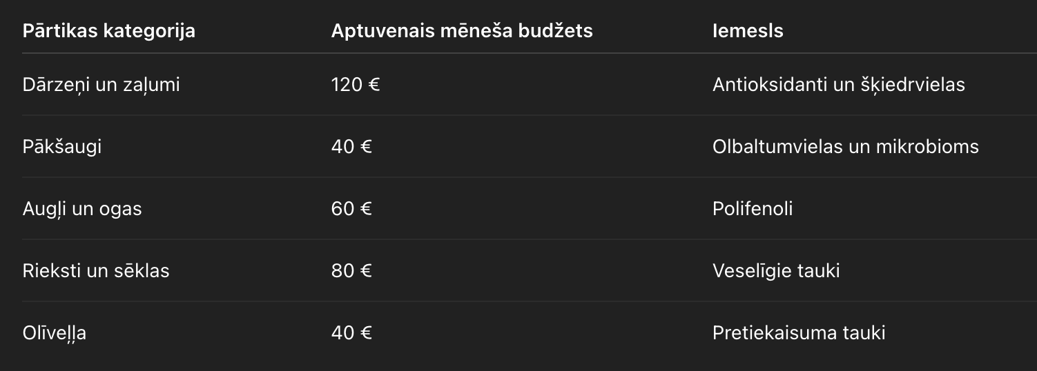Pirmkārt, aptuveni trešdaļa budžeta tiek novirzīta uzturam. Tas nozīmē, ka pārtika tiek izvēlēta ļoti apzināti – vairāk dārzeņu, vairāk šķiedrvielu un mazāk pārstrādātu produktu. Šī investīcija tieši ietekmē metabolismu un enerģijas līmeni.