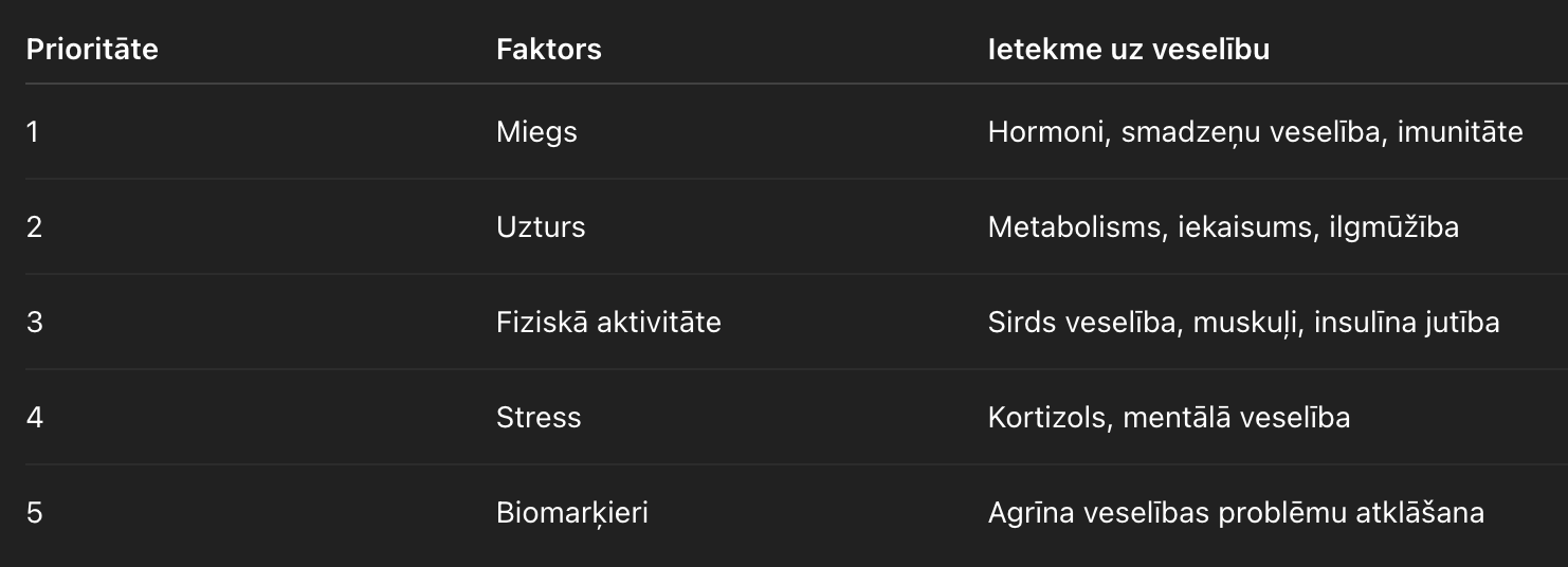 Ja Brian Johnson sistēmu sadalītu pēc ietekmes uz veselību, tā izskatītos kā prioritāšu piramīda. Augšā atrodas dārgas optimizācijas tehnoloģijas, bet pašā pamatā ir vienkārši dzīvesveida faktori. Lielākā daļa cilvēku kļūdaini koncentrējas uz piramīdas augšdaļu – uztura bagātinātājiem, biometriskajiem sensoriem un eksperimentālām terapijām. Taču patiesībā tie dod tikai nelielu procentu no kopējā efekta.