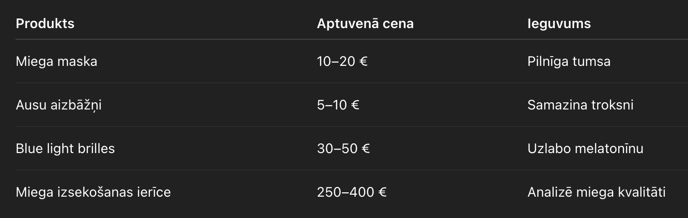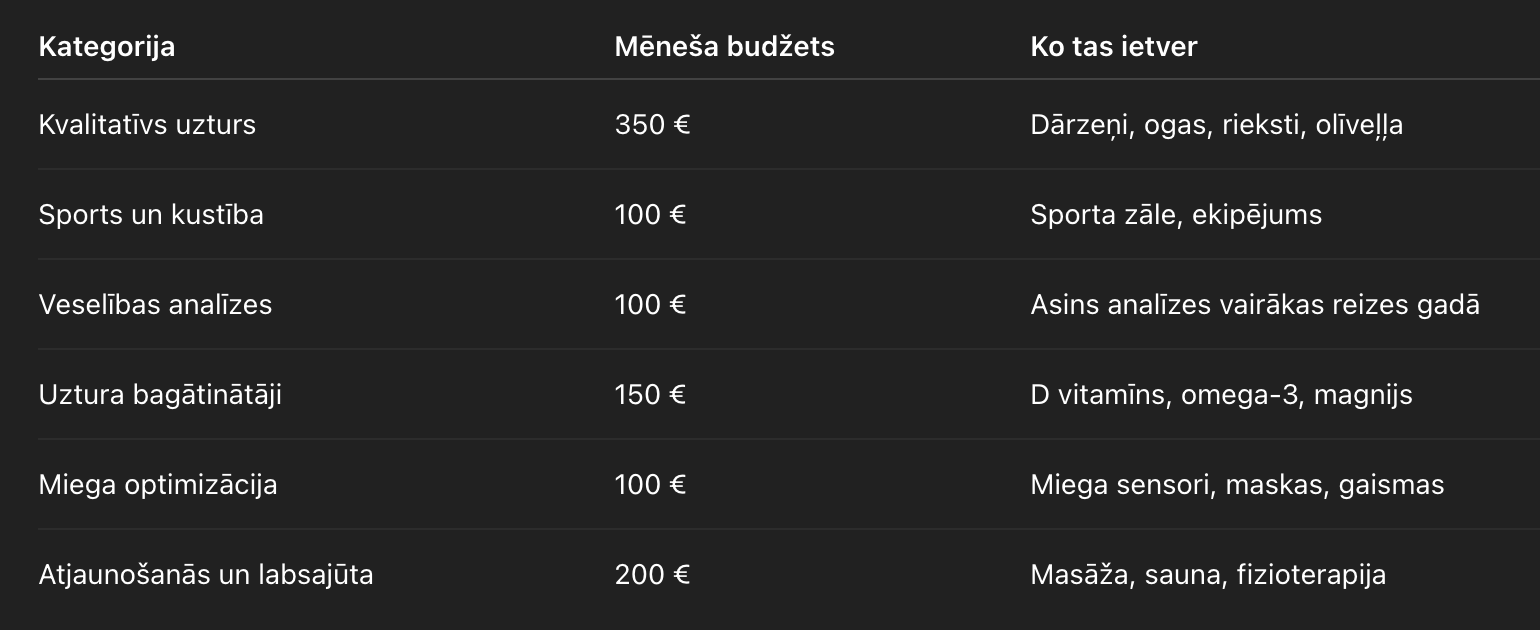 Ja šos principus sakārto pēc svarīguma, kļūst skaidrs, kur būtu jāvirza lielākā daļa 1000 € budžeta. Pirmkārt – miegs. Otrkārt – uzturs. Treškārt – fiziskā aktivitāte. Pārējie elementi ir sekundāri.